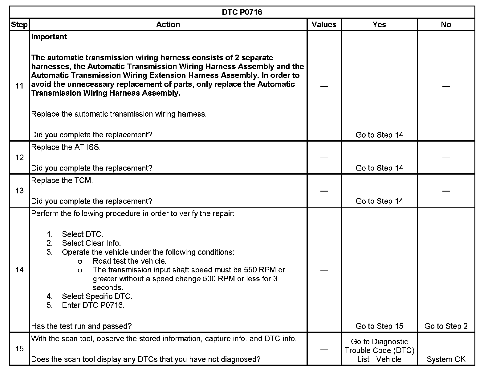 ^ The TCM stores DTC P0716 in TCM history during the second consecutive trip in which the Conditions for Setting the DTC are met.