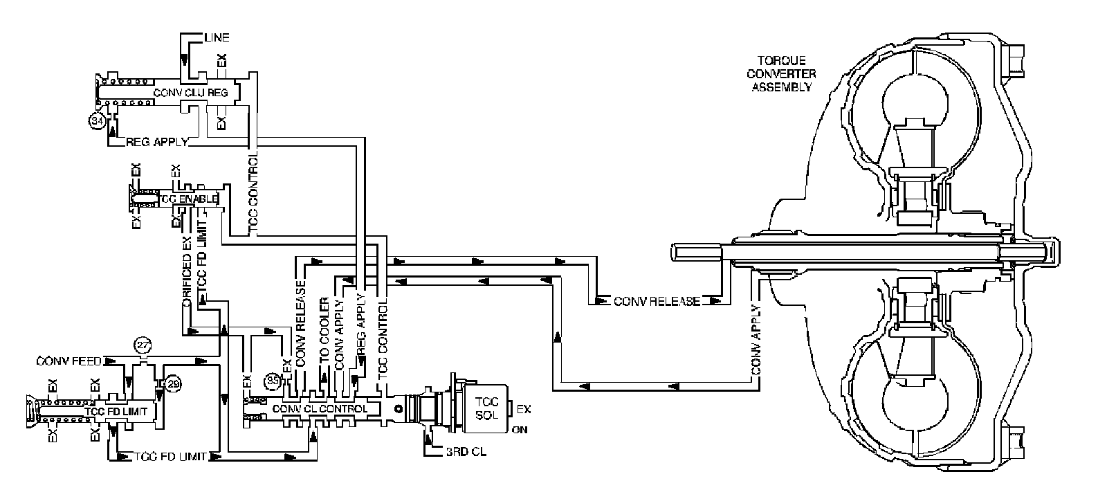 The transmission control module (TCM) controls the torque converter clutch (TCC) solenoid valve pulse width modulation (PWM). The solenoid controls the hydraulic fluid for TCC apply and release. When the TCC is applied, the engine is coupled directly to the transmission through the TCC. The TCC slip speed should be near 0.