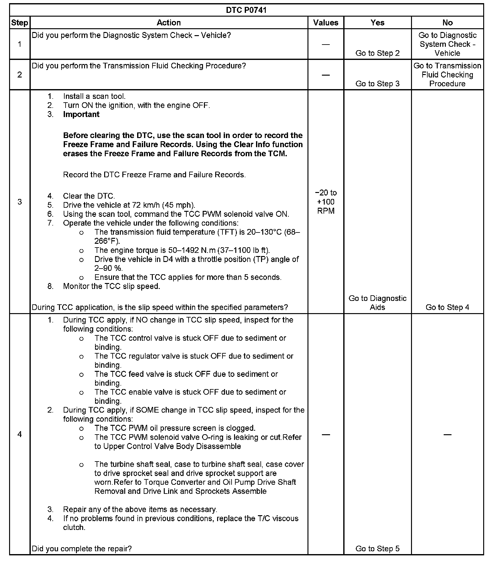 If the TCM detects high torque converter slip when the TCC is commanded ON, then DTC P0741 sets. DTC P0741 is a type B DTC.