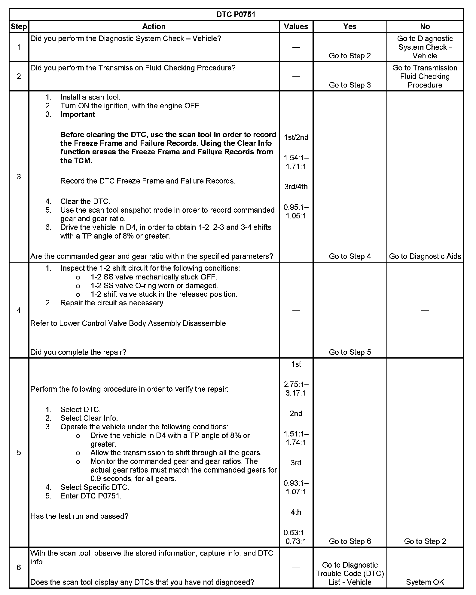 The transmission control module (TCM) monitors the actual gear ratio, and compares the actual gear ratio with the commanded gear ratio. DTC P0751 sets under two conditions: