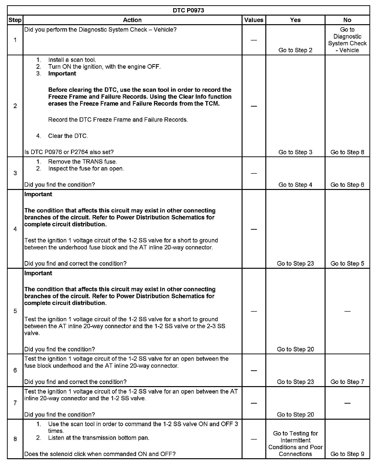 ^ The TCM stores DTC P0973 in TCM history during the second consecutive trip in which the Conditions for Setting the DTC are met.
