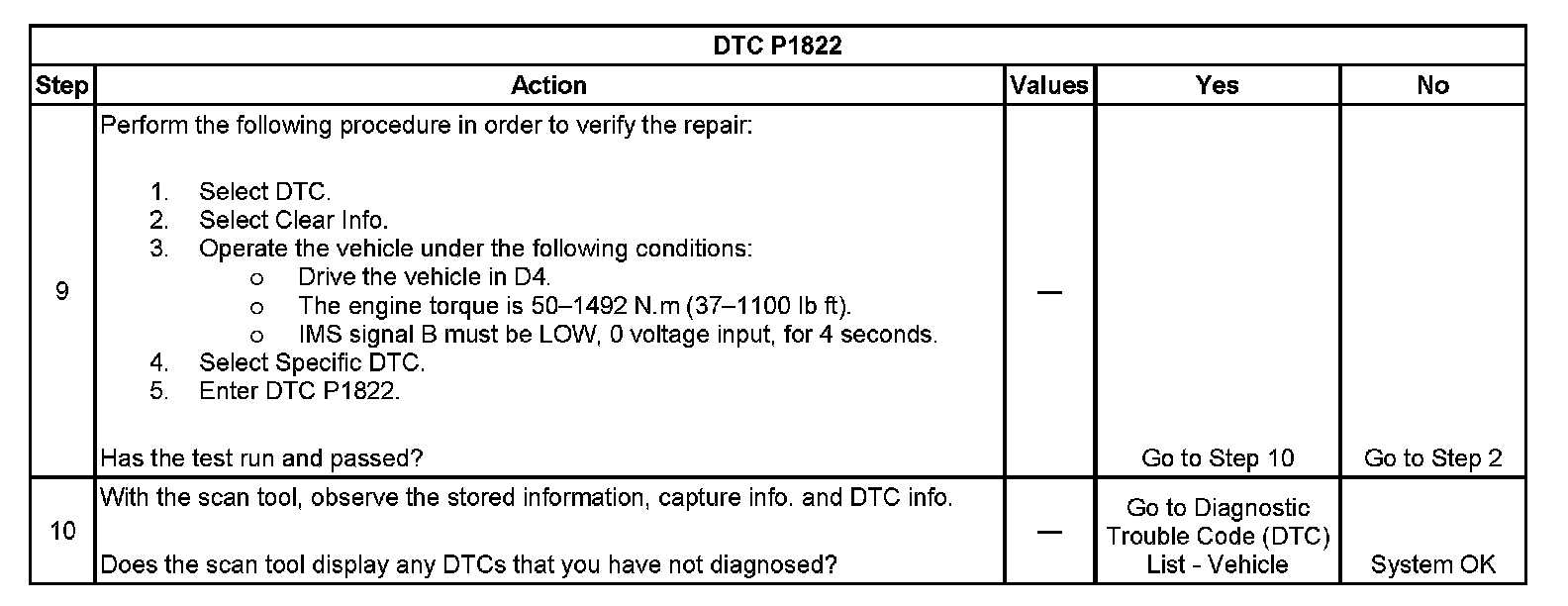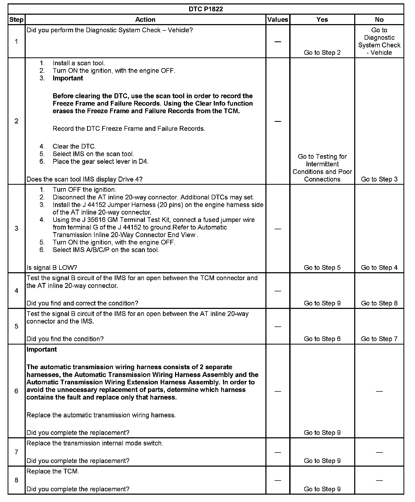 If the TCM detects an IMS transitional state between D2 and D1 while the vehicle is in motion, then DTC P1822 sets. DTC P1822 is a type B DTC.