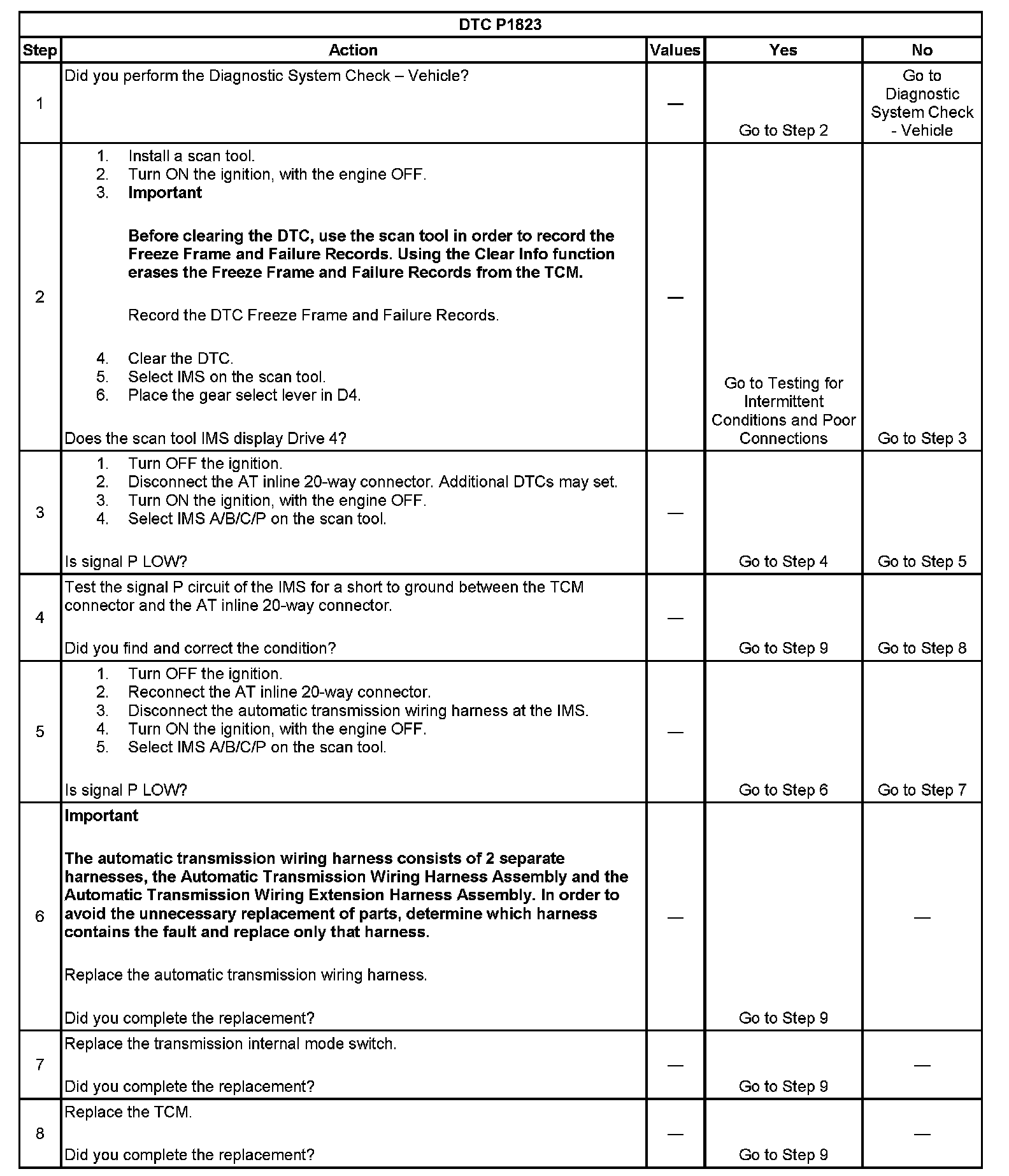 ^ The TCM stores DTC P1823 in TCM history during the second consecutive trip in which the Conditions for Setting the DTC are met.
