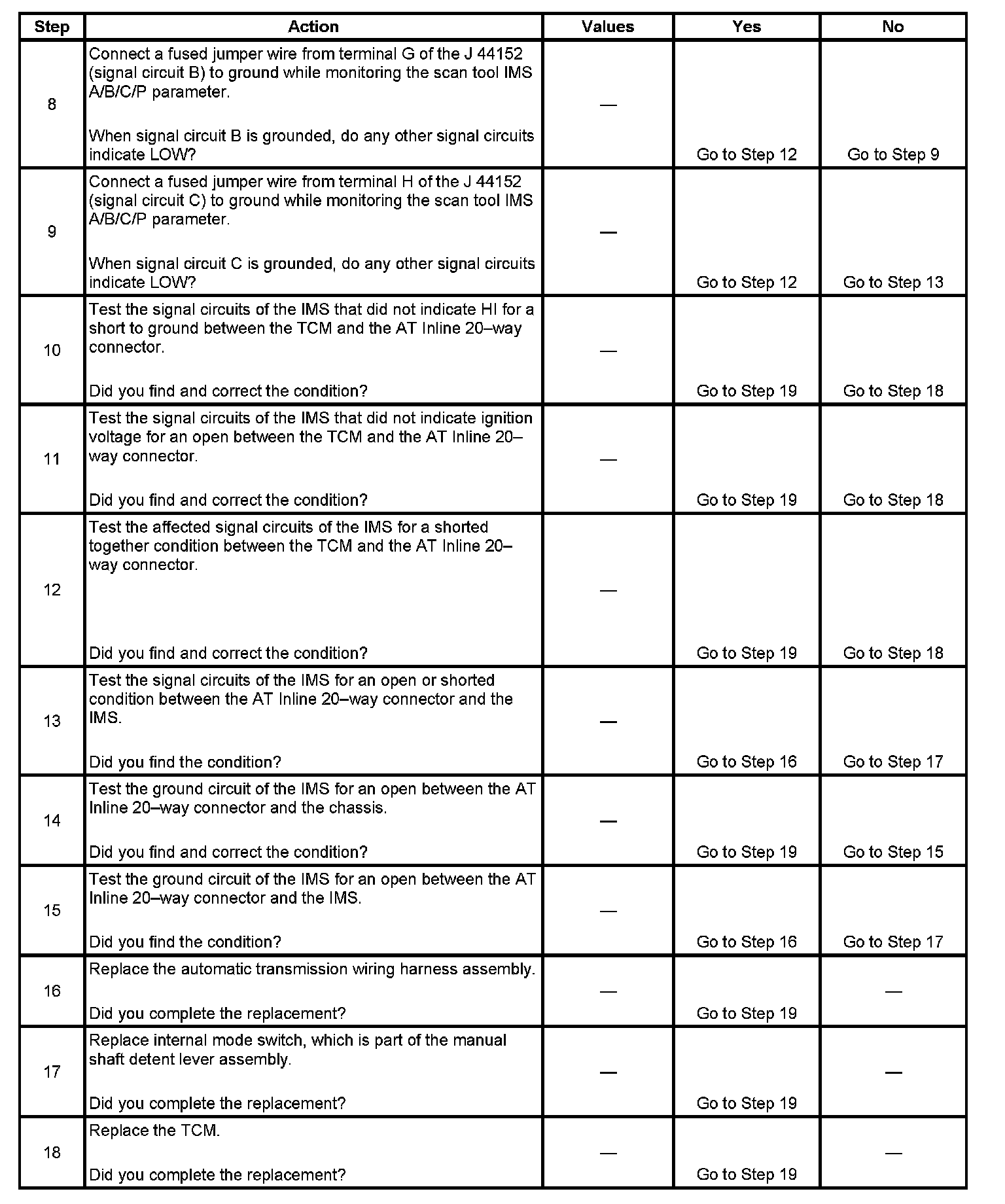 13. This step tests the internal transmission harness. If no fault is found in the harness, the fault will be in the switch.