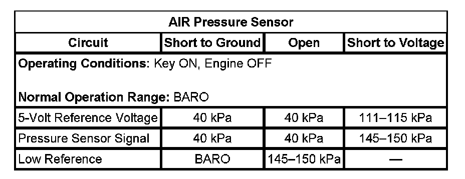 - If less than approximately 140 kPa, test the signal circuit for an open, or a short to ground. If the circuit test normal, replace the control module.