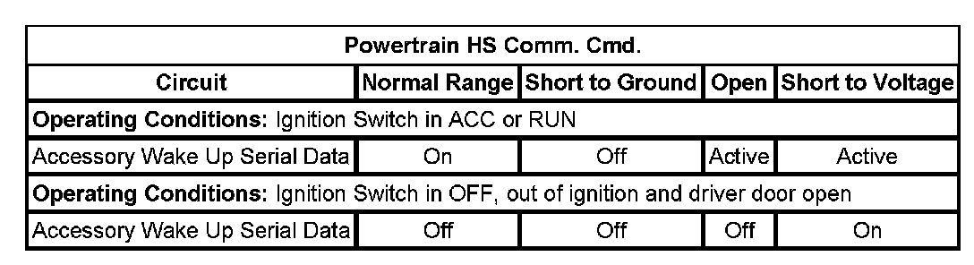 The accessory wake up serial data circuit is a positive voltage signal to wake up the engine control module (ECM) and the transmission control module (TCM). The signal is activated in 2 ways. Any time the ignition switch is in the ACC or RUN position, or anytime the body control module (BCM) determines that communication is needed from the powertrain. When the ignition switch is in the ACC or RUN position, the input to the BCM is internally connected to the accessory wake up serial data circuit, and voltage is supplied. The BCM supplies voltage to the accessory wake up serial data when it determines that communication is necessary with the powertrain and the ignition is not in the ACC or RUN position such as during remote start.