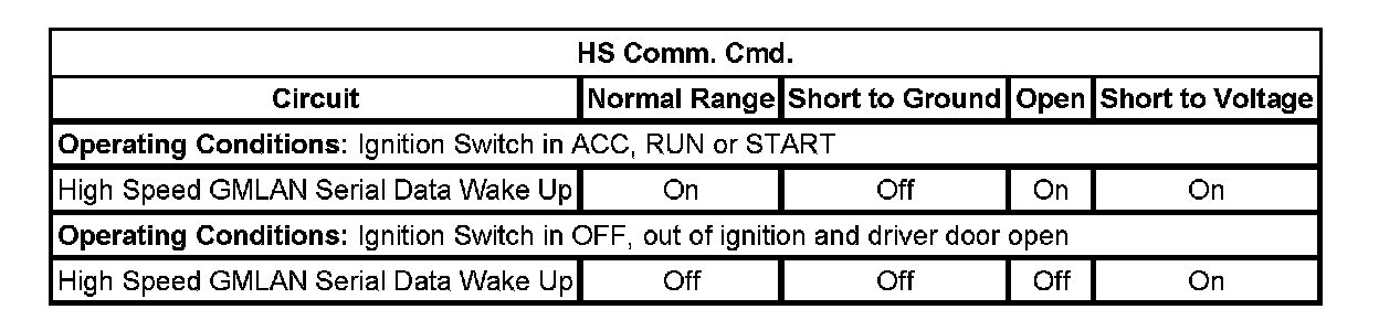 The body control module (BCM) applies voltage to the high speed GMLAN serial data wake up circuit, when the ignition key is in ACC, ON or START to enable several modules for bus communication.
