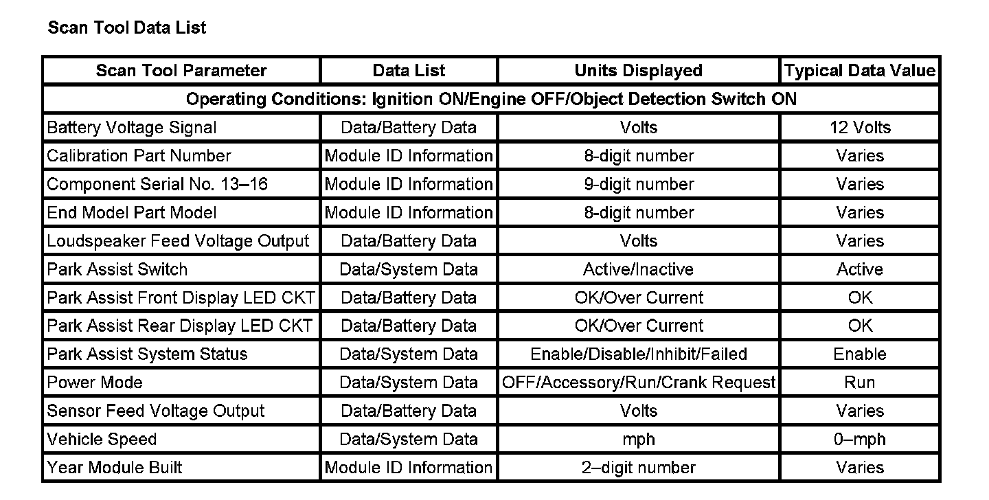 The scan tool data list contains all the object detection system related parameters that are available on the scan tool. The parameters in the list are arranged in alphabetical order. The column, Data List, indicates the location of the parameter within the scan tool menu selections.