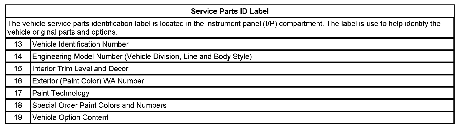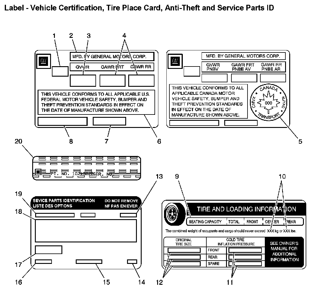 Label - Vehicle Certification, Tire Place Card, Anti-Theft and Service Parts ID: