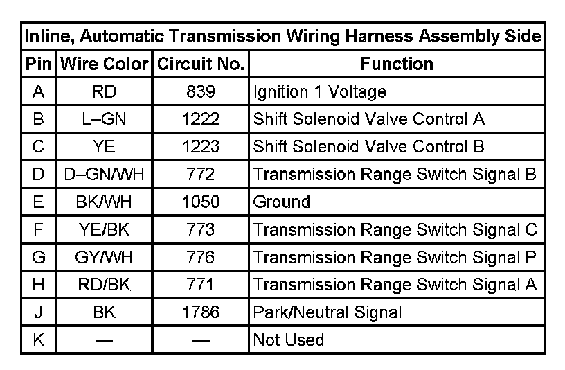 Inline, Automatic Transmission Wiring Harness Assembly Side: