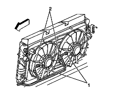 4. Attach the wiring harness retaining clips (2) to the fan shroud.