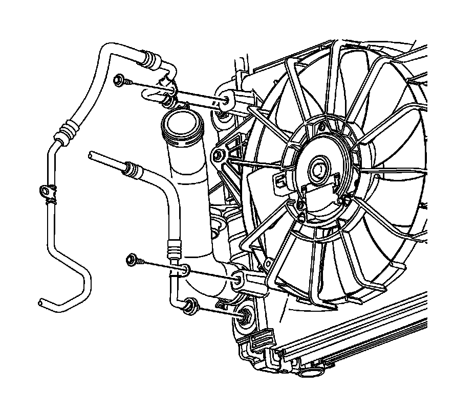 8. Install the transmission oil cooler pipe retaining bolts to the fan shroud.