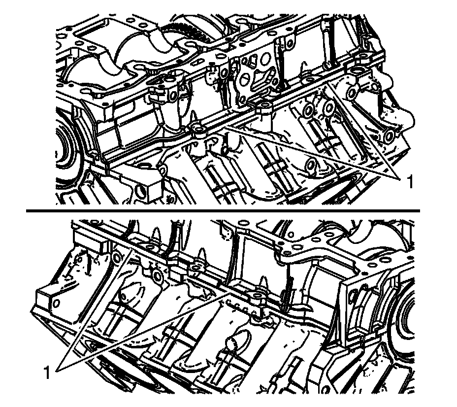 4. Remove the main bearing bolts. Note the location of the single stud-end bolt (1) used to attach the oil pump pickup tube.