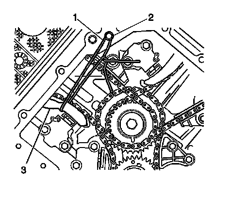 6. Remove the mechanics wire (1) supporting the right secondary camshaft drive chain shoe (3).