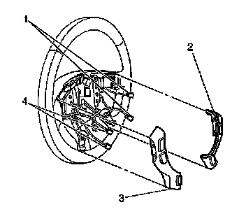 2. Align the steering control switch (2) engagement tabs to the steering wheel. Push in on the steering wheel control switch (2) in order to secure the control switch to the steering wheel.