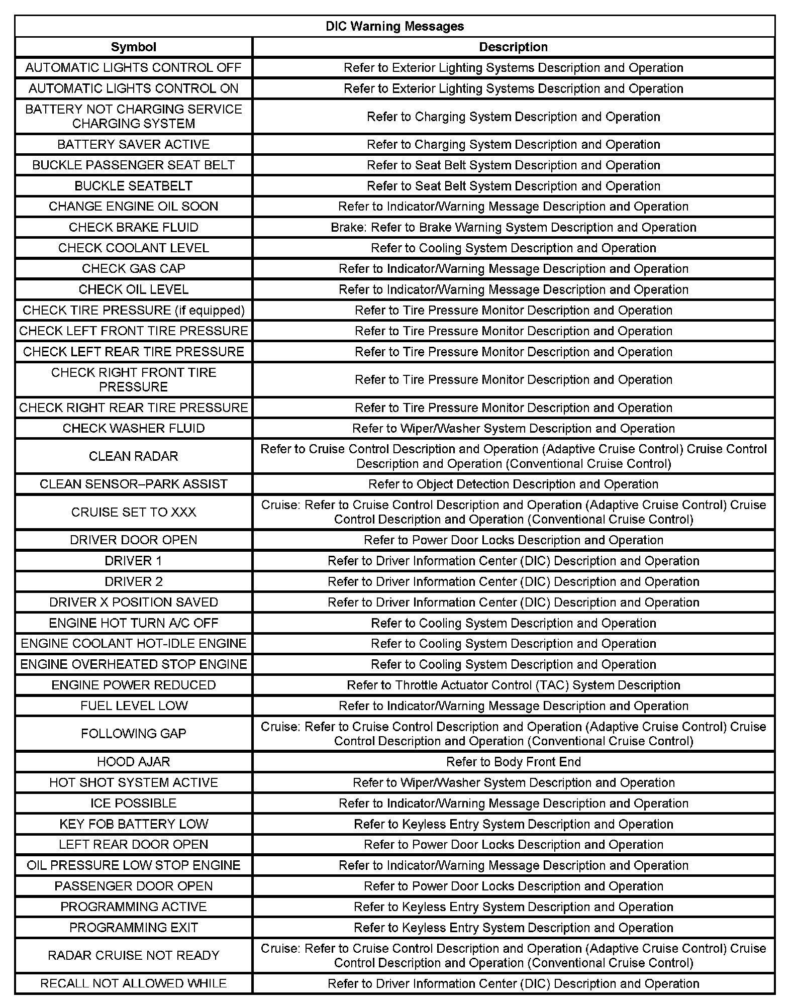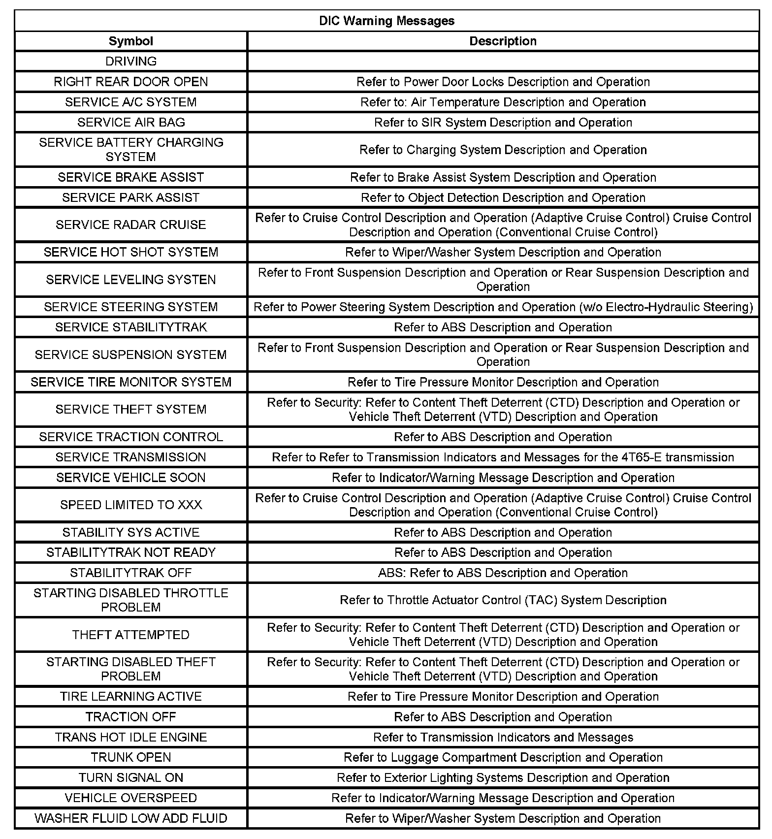 The driver information center (DIC) displays VEHICLE OVERSPEED when the instrument panel cluster (IPC) determines that the vehicle speed is more than 120 km/h (75 mph).