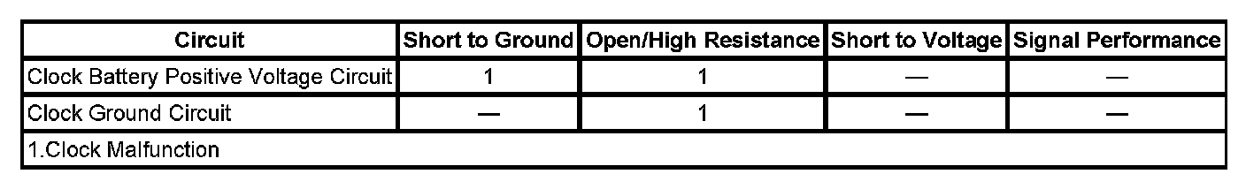 The instrument panel cluster (IPC) is equipped with an analog clock. The analog clock utilizes the clock battery positive voltage circuit and the clock ground circuit to operate. An open circuit condition, a high resistance or a short to ground in the battery positive circuit or the ground circuit will cause the clock not to operate properly.