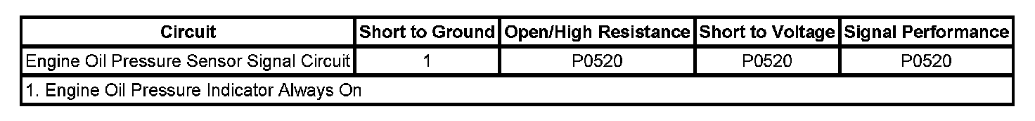 The engine oil pressure (EOP) switch is a normally closed switch that opens with the proper oil pressure. With the ignition switch turned ON and the engine not running, the engine control module (ECM) should detect a low signal voltage input. With the engine running, the pressure switch opens, and the ECM should detect a high signal voltage input. The ECM tests the state of the EOP signal circuit with the ignition switch turned ON, and the engine turned OFF. If the ECM detects a high voltage input on the EOP signal circuit, DTC P0520 sets. The instrument panel cluster (IPC) illuminates the EOP indicator when the IPC receives a serial data message from the ECM requesting the EOP indicator turned ON.