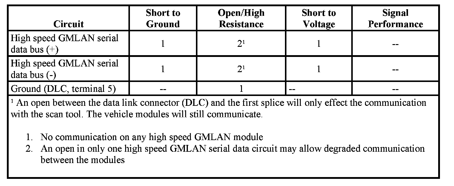 - A short between high speed GMLAN (+) and high speed GMLAN (-) circuits.