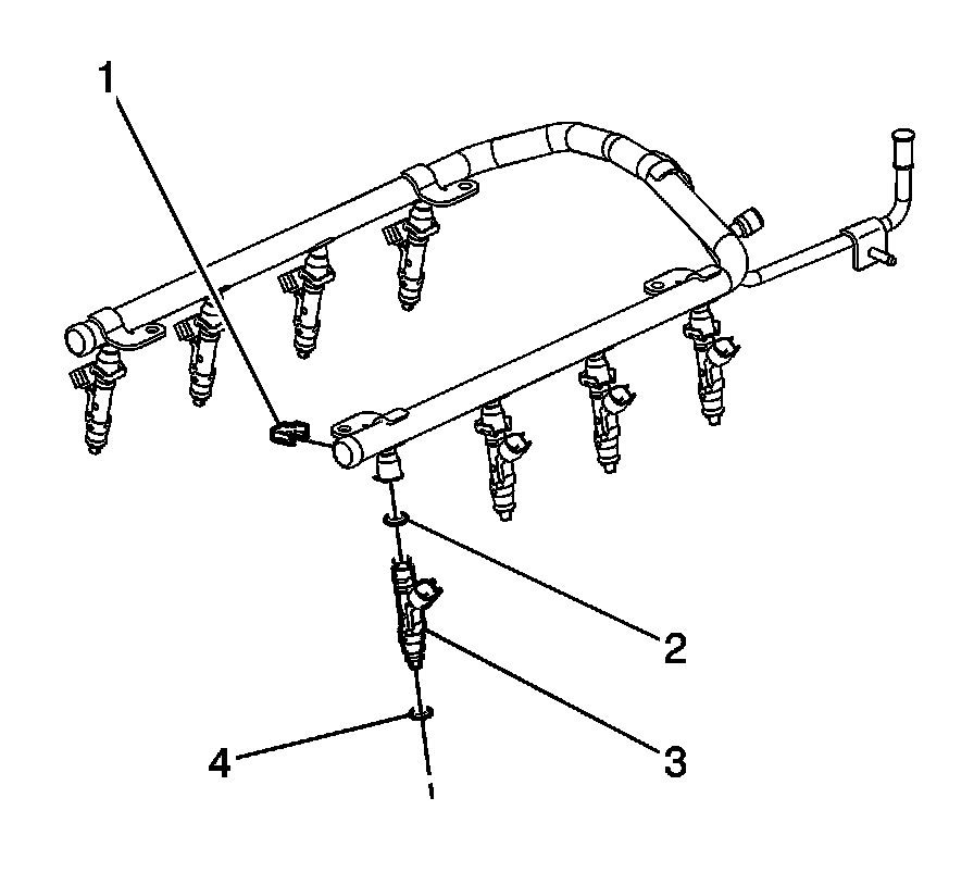 4. Remove and discard the fuel injector upper (2) and lower (4) O-ring seals.
