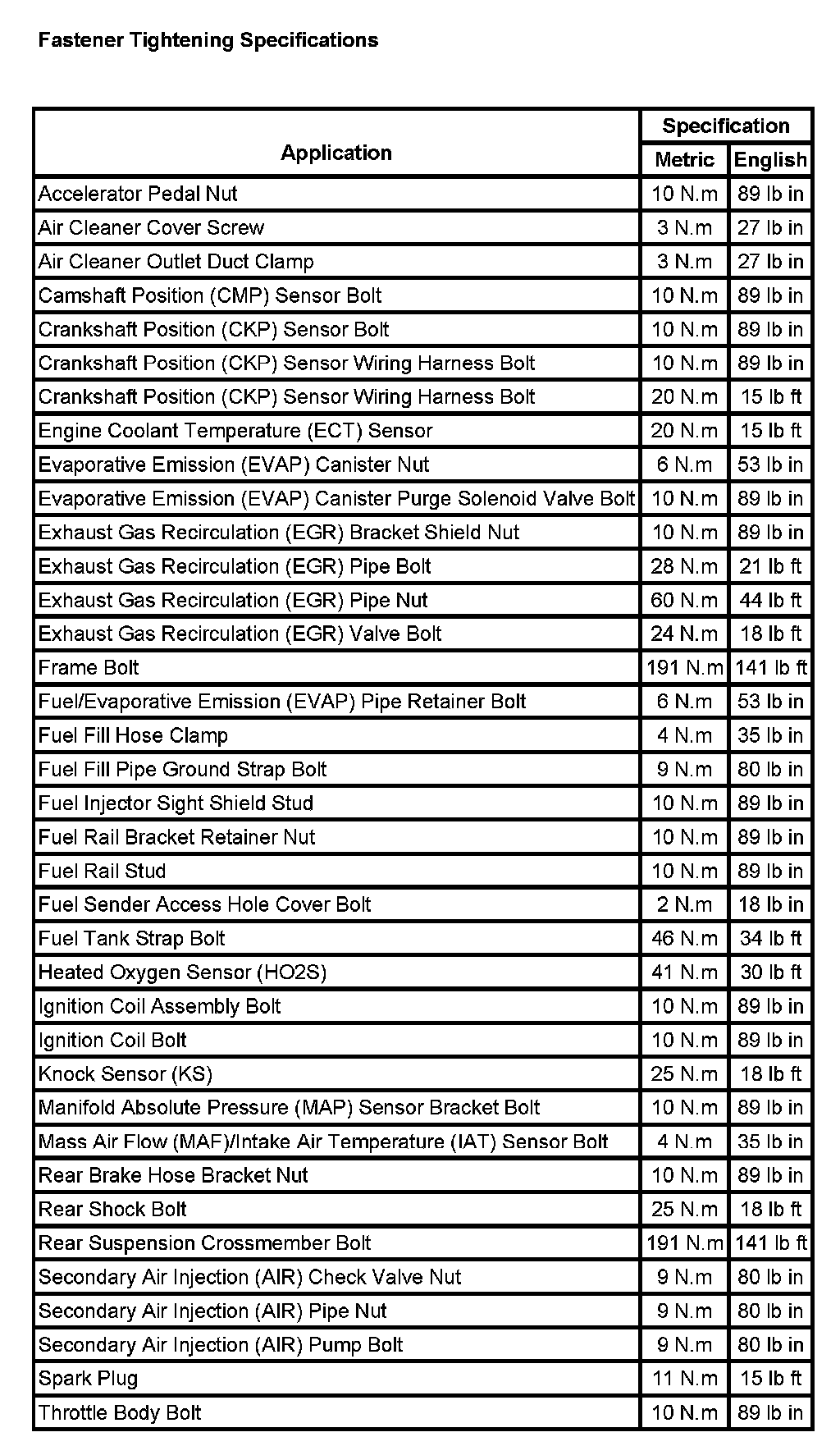Fastener Tightening Specifications: