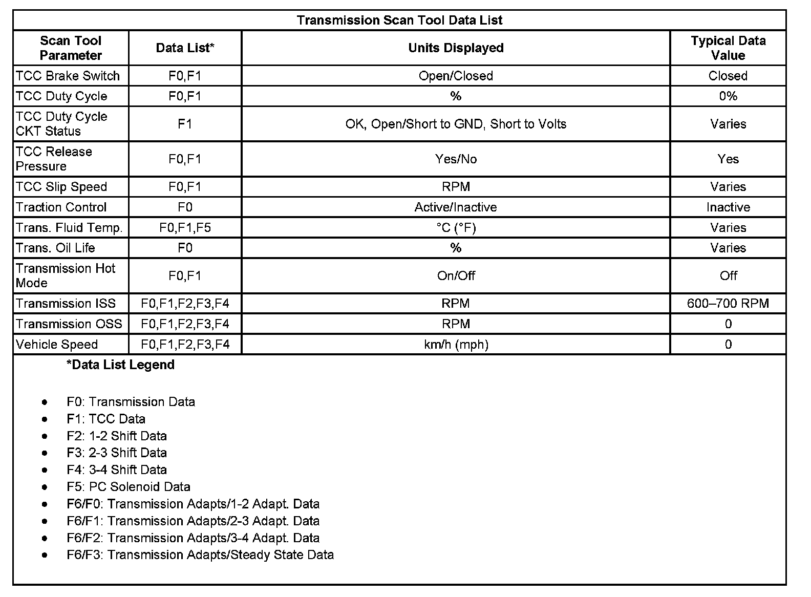 Only the parameters listed below are used in this manual for diagnosing. If a scan tool displays other parameters, the values are not recommended by General Motors for use in diagnosis.