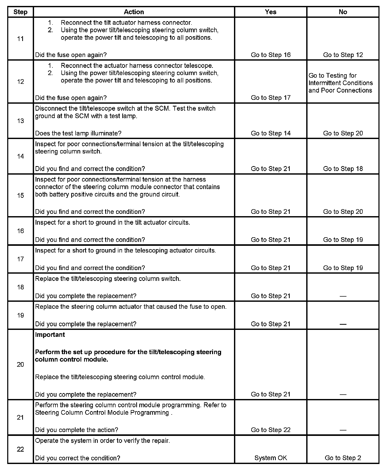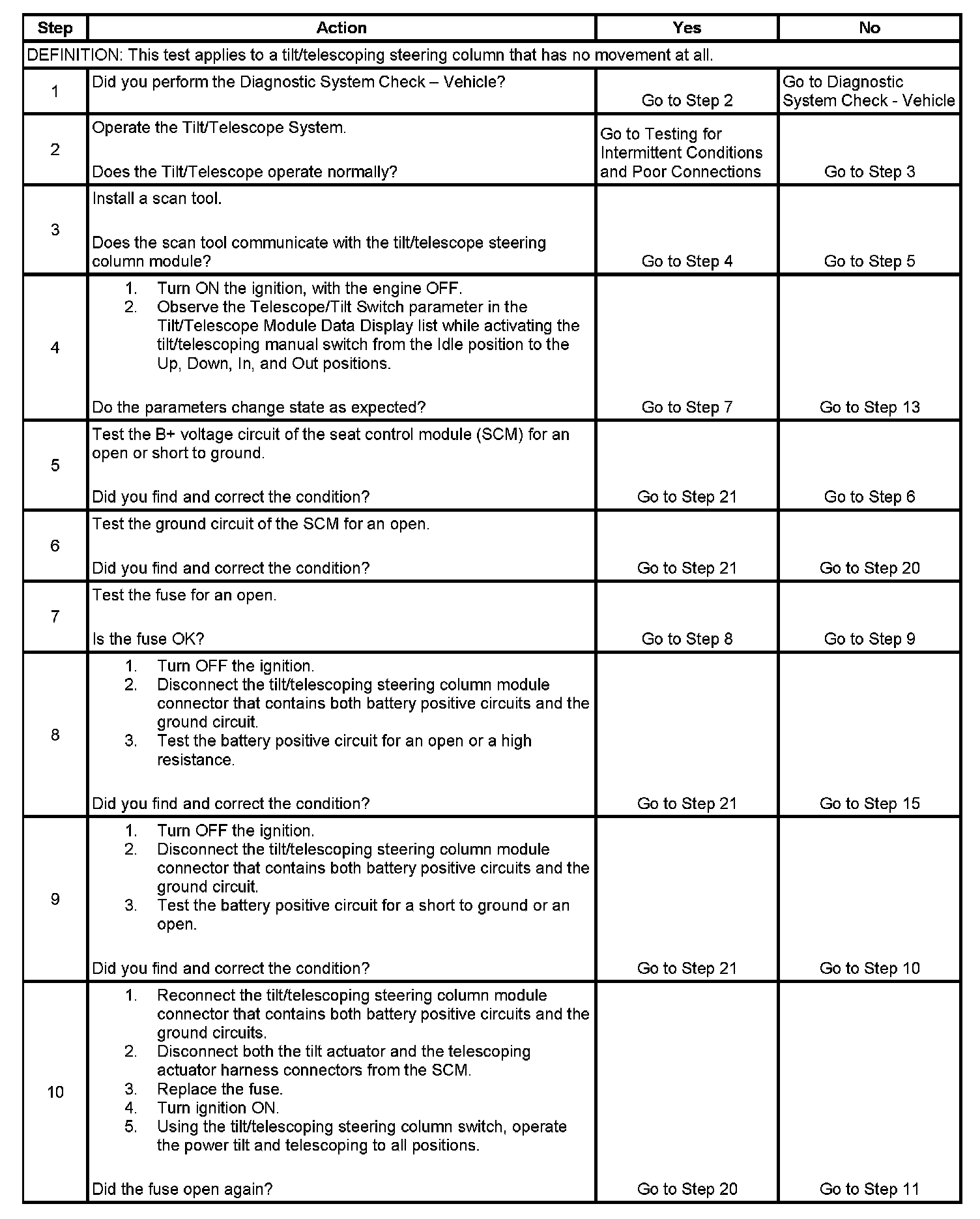 8. If either the tilt actuator or the telescope actuator displays Motor Current on the scan tool Data Display, as less than 0 amps and/or more than 10 amps in this step, go to the applicable chart for that actuator being inoperative.