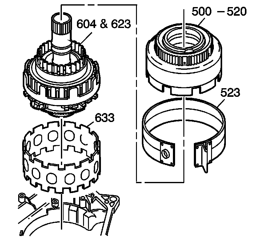 3. Remove the third clutch and the reaction carrier assemblies. Grasp the input shaft to remove the third clutch and reaction carrier assembly (604, 623).