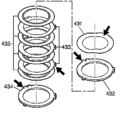 1. Inspect the second clutch wave plate (431) and all of the steel plates (433) for burning or damage.