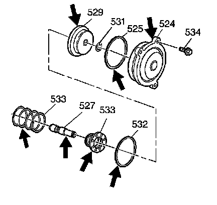 4. Install the 4th servo piston assembly (529) and the spring (533) into the 4th servo cover (524). Apply pipe thread sealant GM P/N 12346004 to bolt threads before installation.