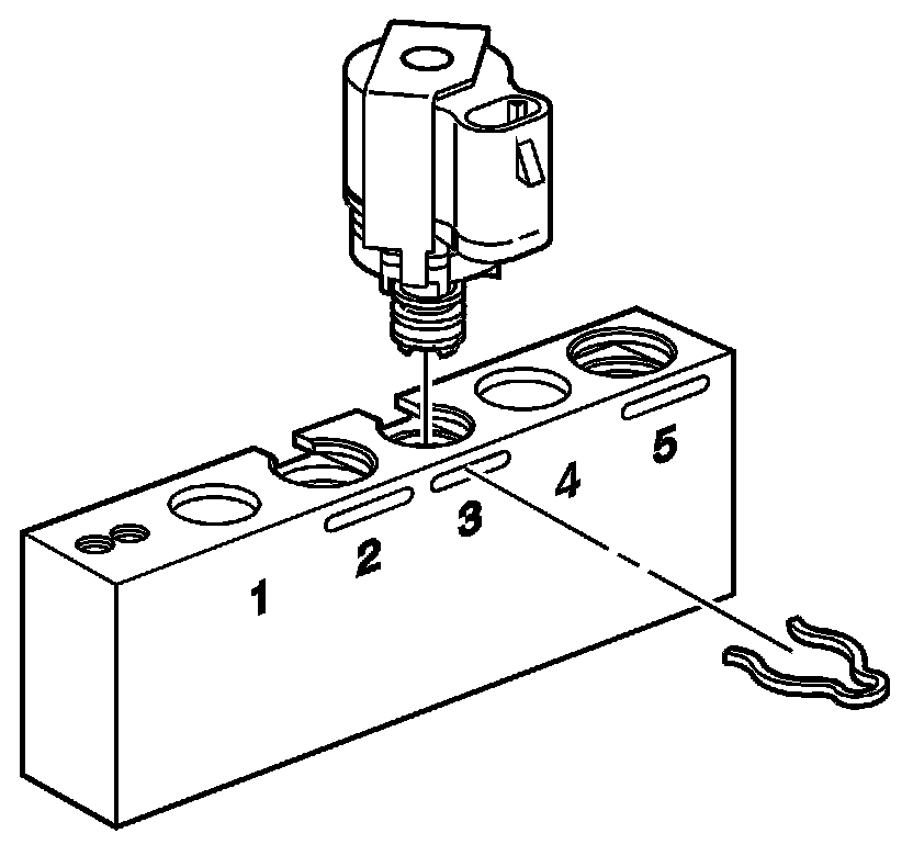2. Install the 1-2 shift solenoid valve or the 2-3 shift solenoid valve into bore number 3 of the J 44246 and install the factory retainer clip to retain the solenoid.