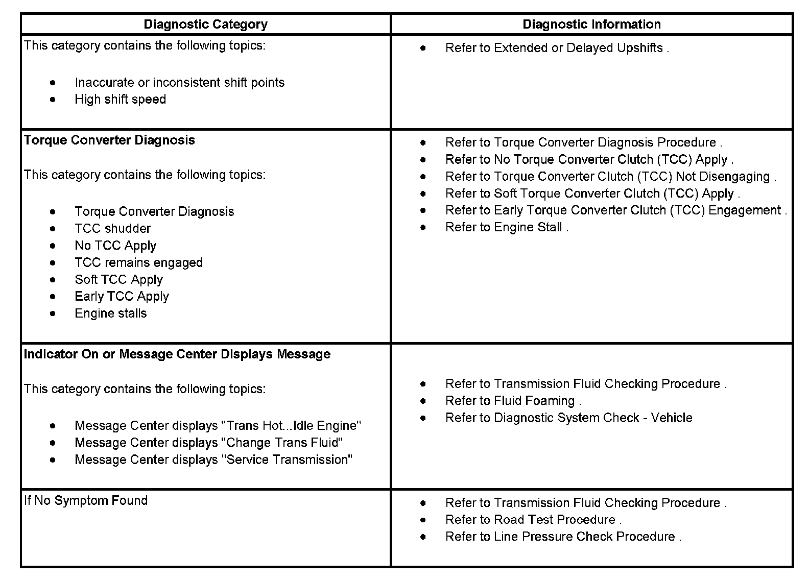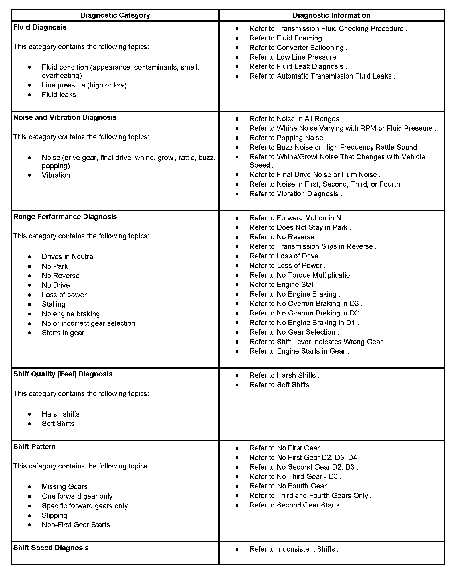 The following table consists of nine diagnostic categories that are located in the left column. Using this column, choose the appropriate category based on the operating conditions of the vehicle or transmission. After selecting a category, use the right column to locate the specific symptom diagnostic information.