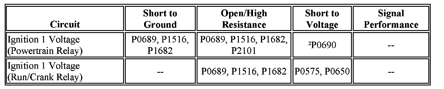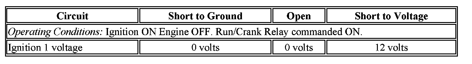 There are 2 ignition 1 voltage circuits supplied to the engine control module (ECM). The first ignition 1 voltage circuit is provided by the powertrain relay, through a fuse. This ignition 1 voltage circuit supplies power to all the internal ECM circuits associated with the throttle actuator control (TAC) operation. The run/crank relay provides the second ignition 1 voltage circuit to the ECM, through a fuse. This ignition 1 voltage provides power to other internal ECM circuits, except those associated with TAC operation. The ECM continuously monitors the voltage level difference between the 2 circuits.