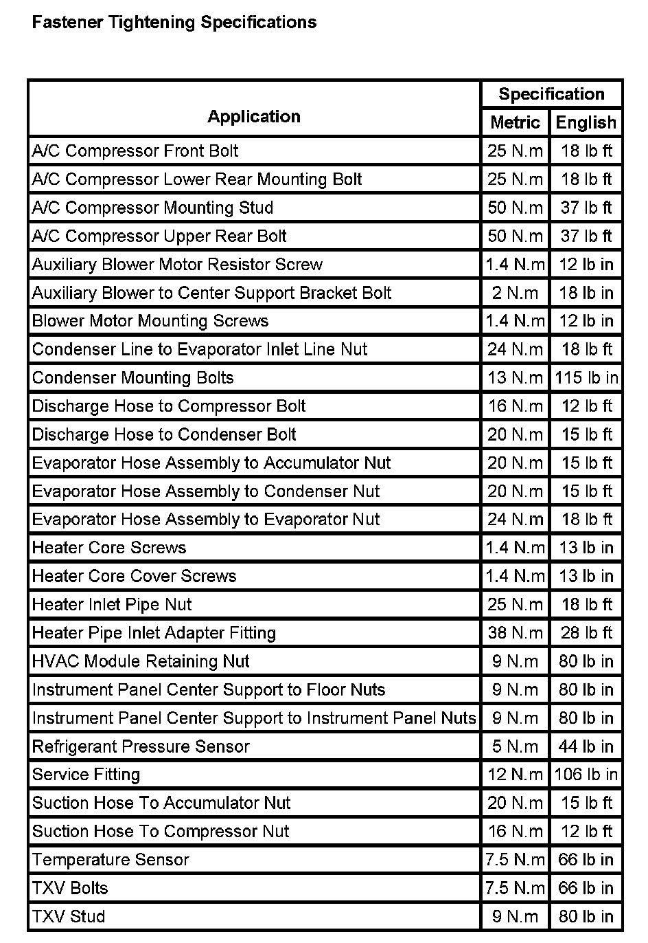 Fastener Tightening Specifications: