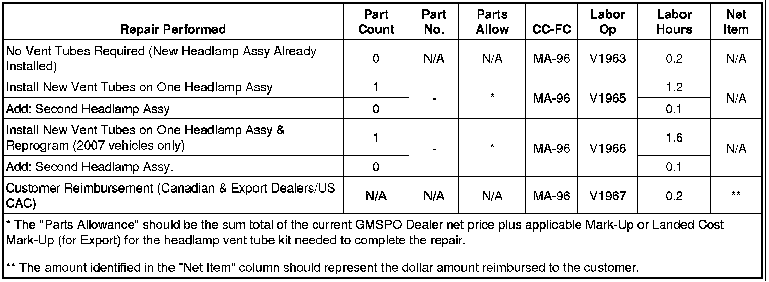 - A programming event is required for 2007 model year vehicles only. Refer to the programming instructions in this bulletin. Some 2007 vehicles will require the headlamp assembly repair and programming event. Refer to the table below to determine if the 2007 model year vehicle requires the headlamp assembly service repair.