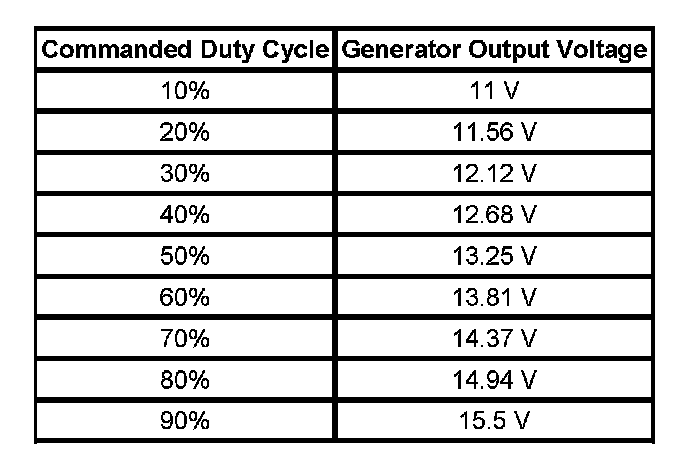 The engine control module (ECM) controls the generator through the generator field control circuit. It monitors the generator performance though the generator field duty cycle signal circuit. The ECM controls the generator through the generator field control circuit. The signal is a 5-volt pulse width modulation (PWM) signal of 128 Hz with a duty cycle of 0-100 percent. Normal duty cycle is between 5-95 percent. Between 0-5 percent and 95-100 percent are for diagnostic purposes. The following table shows the commanded duty cycle and output voltage of the generator: