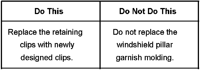 Replace the windshield garnish molding retainer clips with newly designed clips. Refer to Windshield Pillar Garnish Molding Replacement in SI.