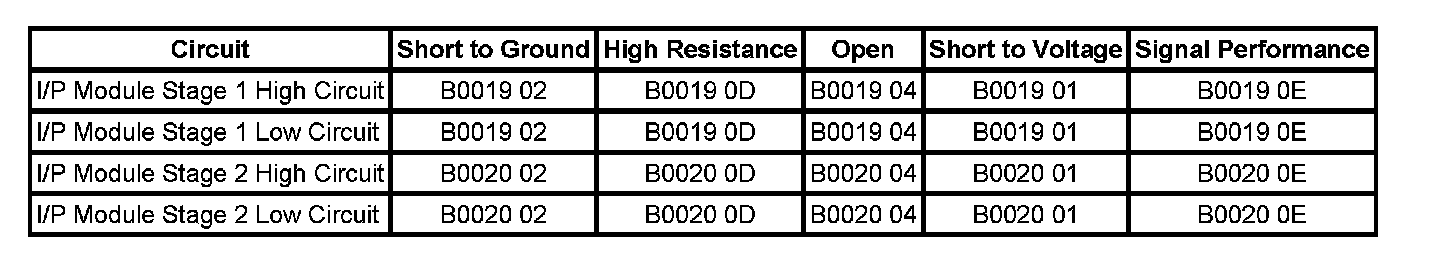 The I/P module high and/or low circuit is short to voltage for 120 milliseconds.