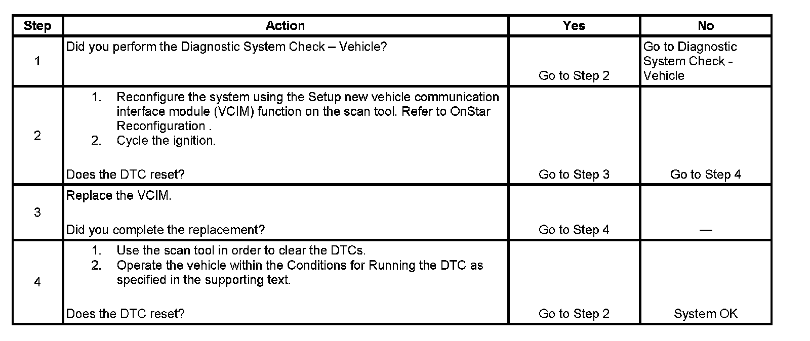 This DTC is set as current in all vehicle communication interface module (VCIM) service parts and has been implemented as a reminder to contact the OnStar(R) Call Center to properly update the customer's account once the new module has been installed. This call is initiated automatically after the installation of the replacement VCIM, and the completion of the Setup New VCIM procedure on the scan tool. No external circuits are involved.