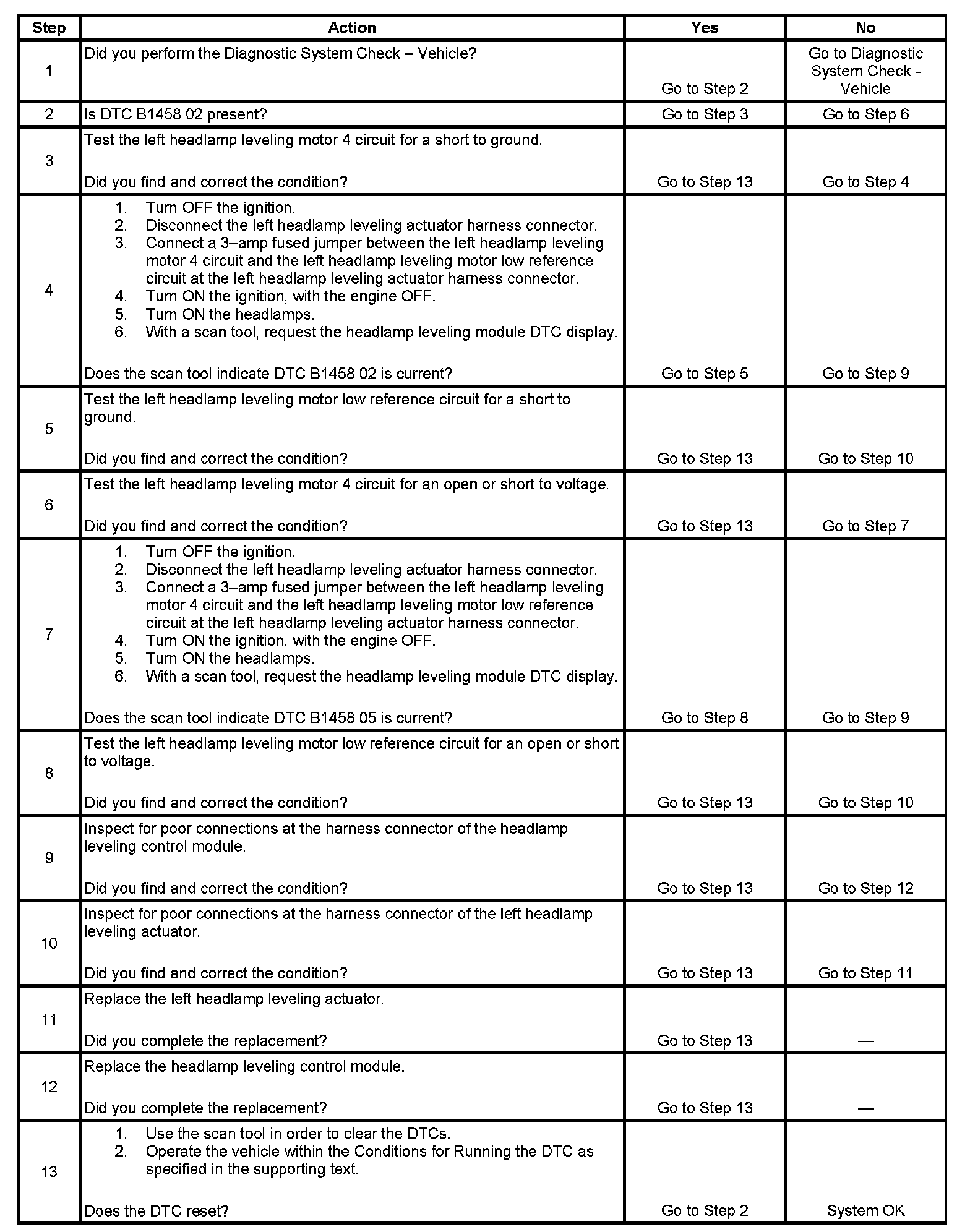 DTC B1458 02: Will set when the headlamp leveling module detects a short to ground in the left headlamp leveling actuator motor 4 control circuit after 4 consecutive monitoring cycles.