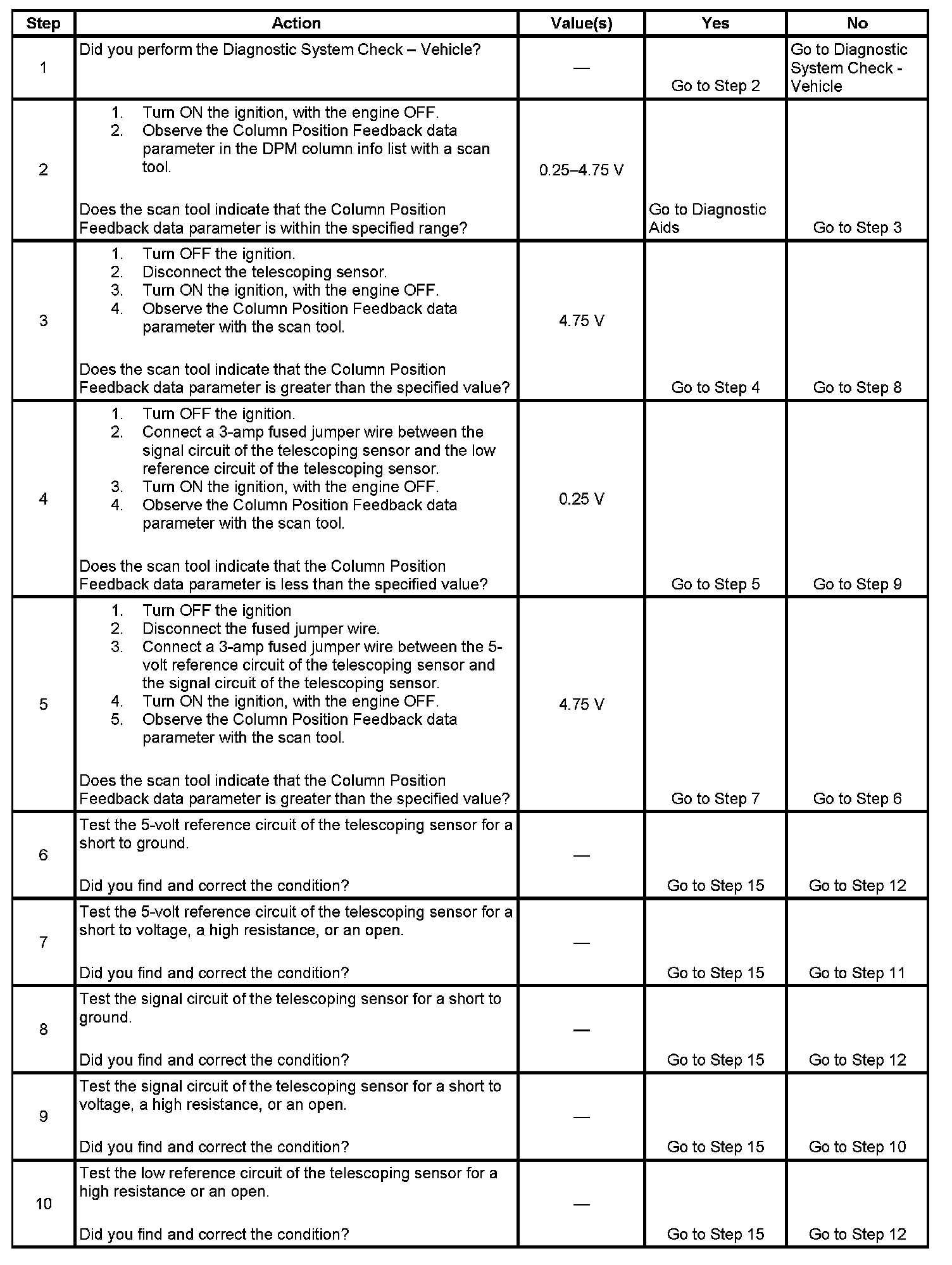 ^ Using a scan tool, select DPM data display and monitor the Column Position Feedback data. Operate the steering column in both directions while monitoring the position sensor data. The voltage should range from 0.25 volt to 4.75 volts depending on the steering column position.