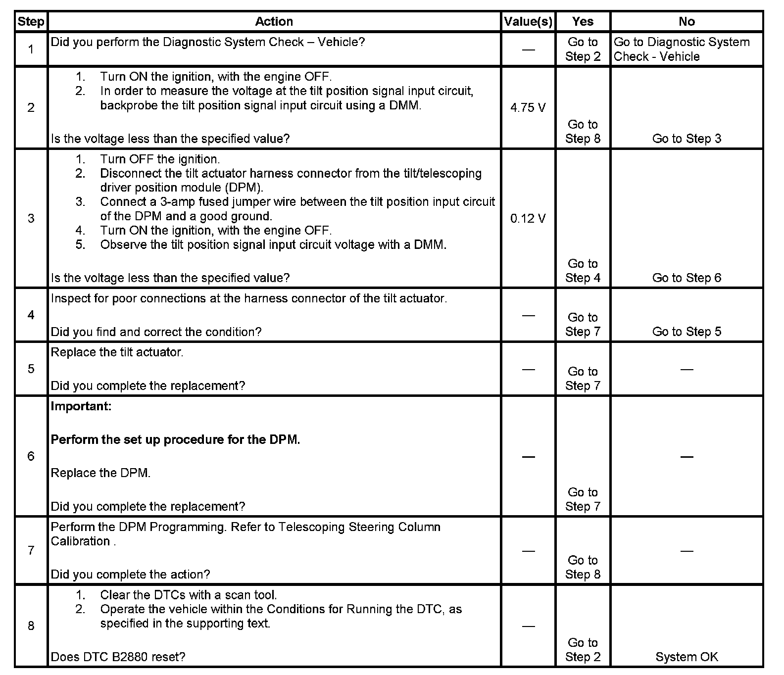 This DTC will set as current when the tilt actuator circuit voltage is less than 0.25 volt or greater than 4.75 volts for 2 seconds.