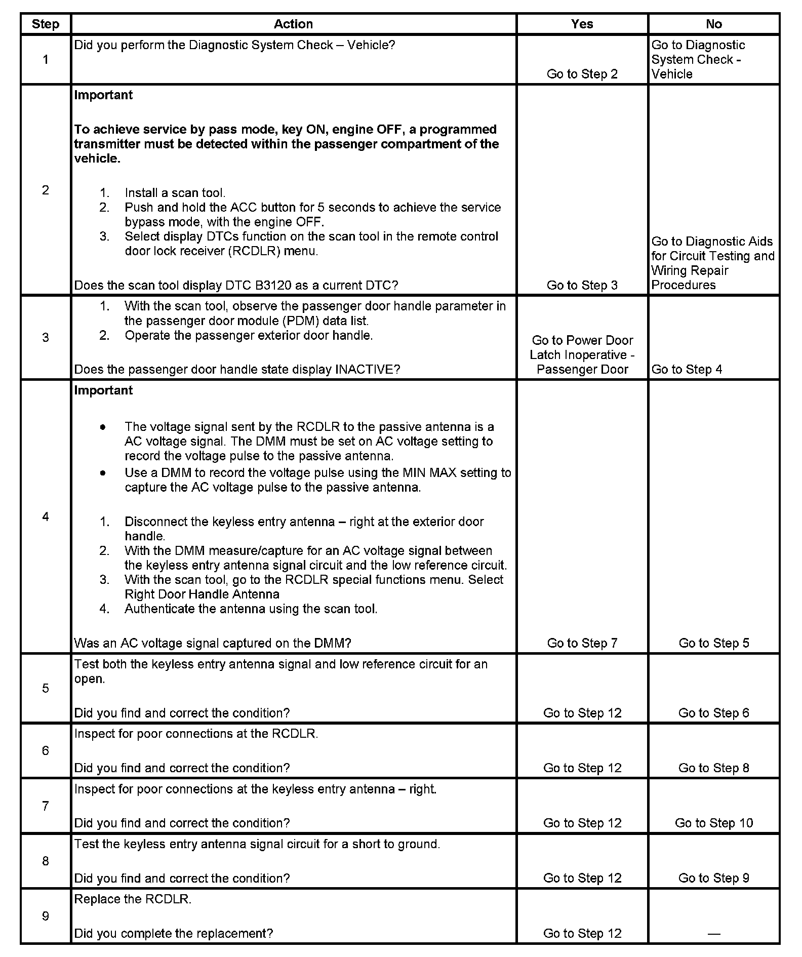 3. Verifies that the passenger door handle is operating properly. A valid input from the passenger door handle is required by the RCDLR to authenticate the antenna.