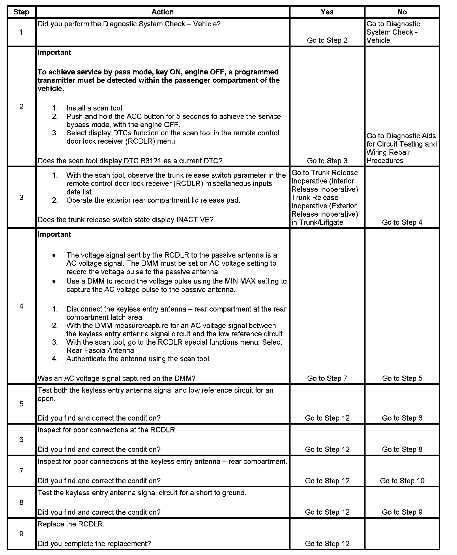 3. Verifies that the exterior rear compartment lid release pad is operating properly. A valid input from the lid release pad is required by the RCDLR to authenticate the antenna.