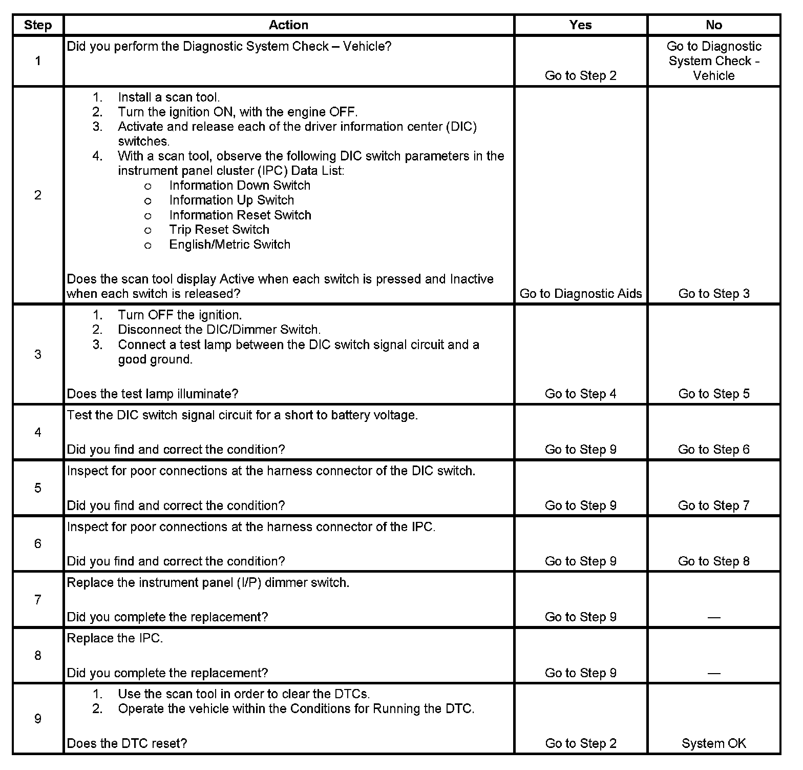 - The IPC detects that the DIC switch signal circuit is shorted to battery.
