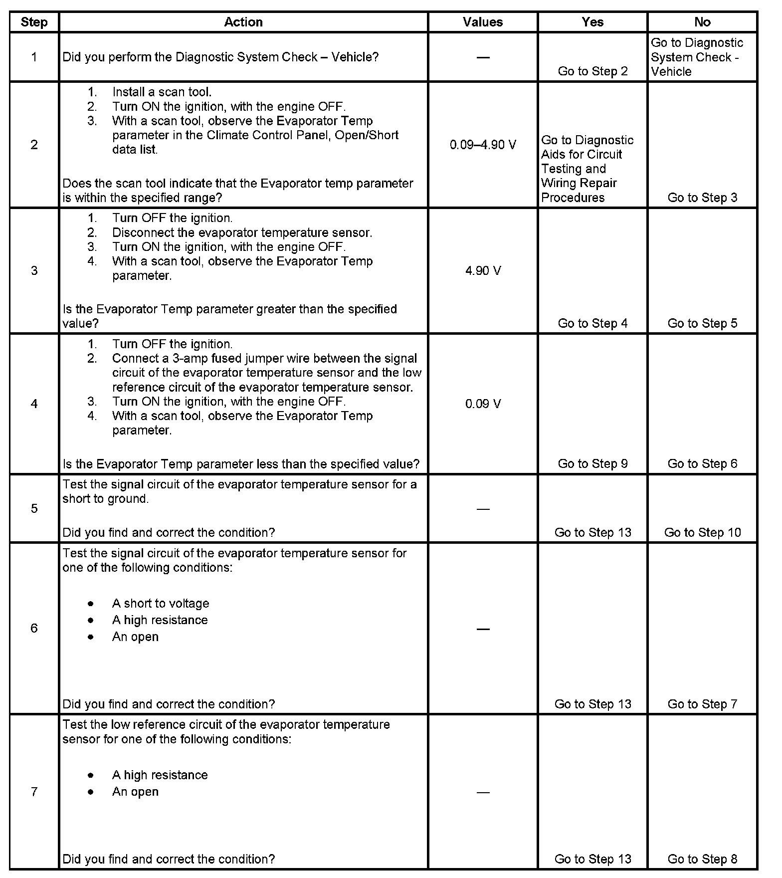 The numbers below refer to the step numbers on the diagnostic table.