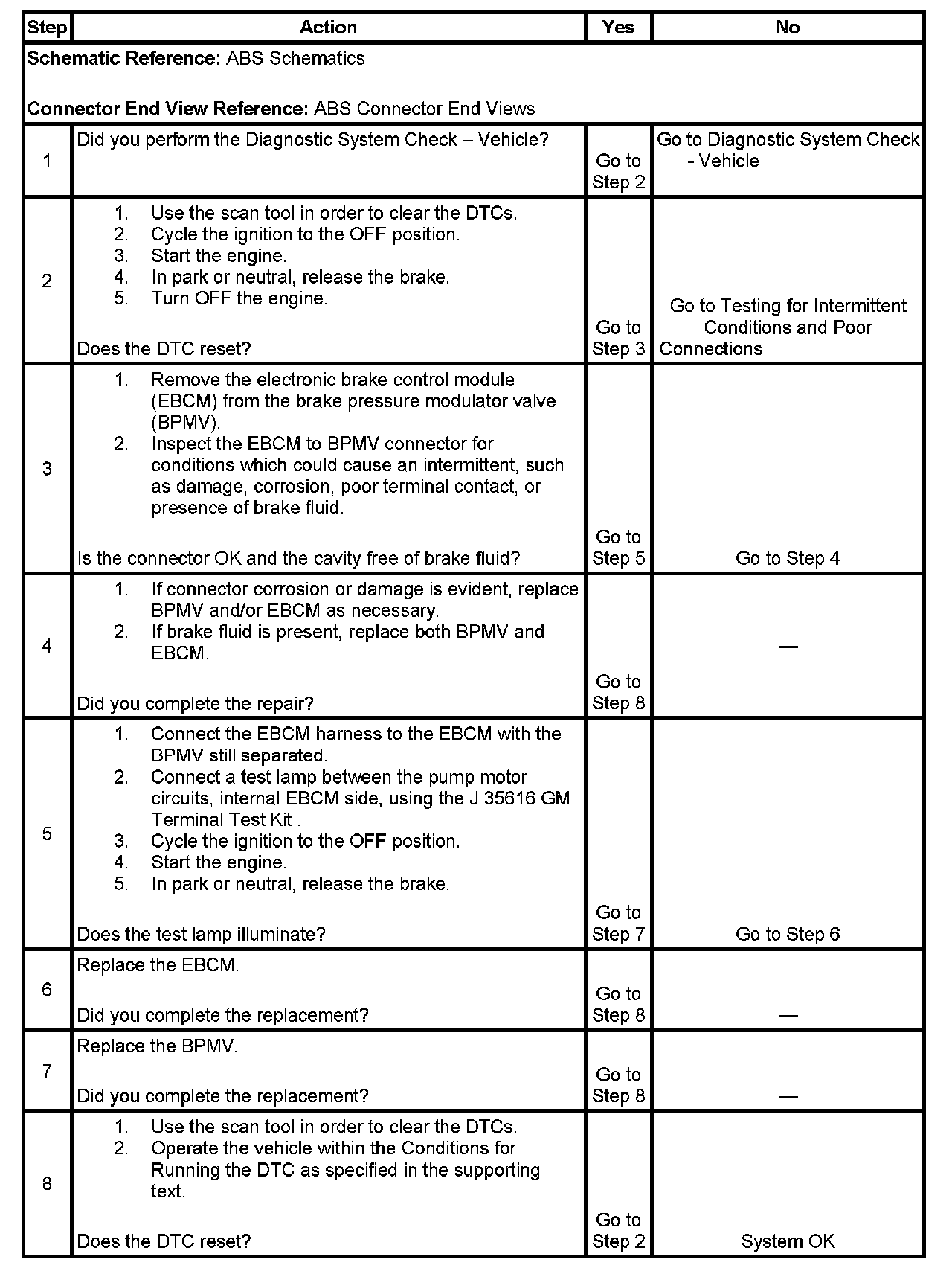 The EBCM detects an open in the pump motor circuit when the voltage across the pump motor is between 10 and 90 percent of ignition voltage.