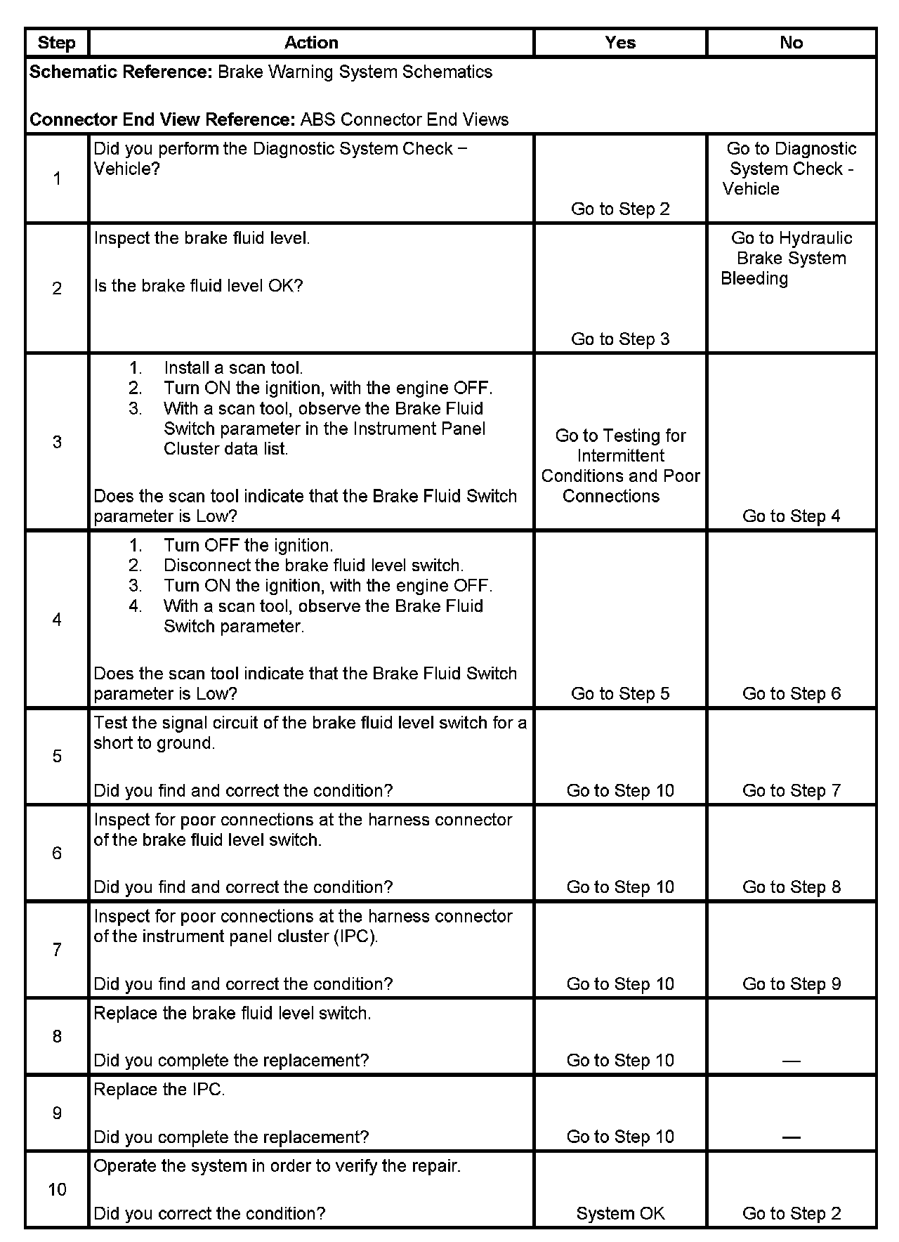 The brake fluid level switch monitors the level of brake fluid in the master cylinder. When the Instrument Panel Cluster (IPC) sees the brake fluid level switch input grounded, it turns ON the red Brake indicator and sends a serial data message to the Electronic Brake Control Module (EBCM) that tells the EBCM that the brake fluid level is low.