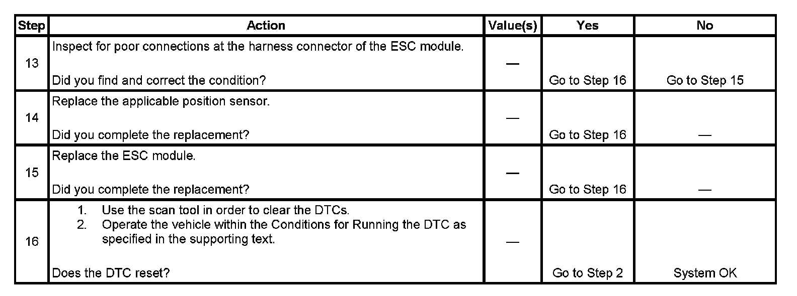 ^ The ESC module uses an ignition cycle counter diagnosis approach to set this DTC. This requires the ESC module to detect a malfunction 4 times before setting the DTC. To disable this feature, use a scan tool to clear all DTCs before performing diagnosis procedures.