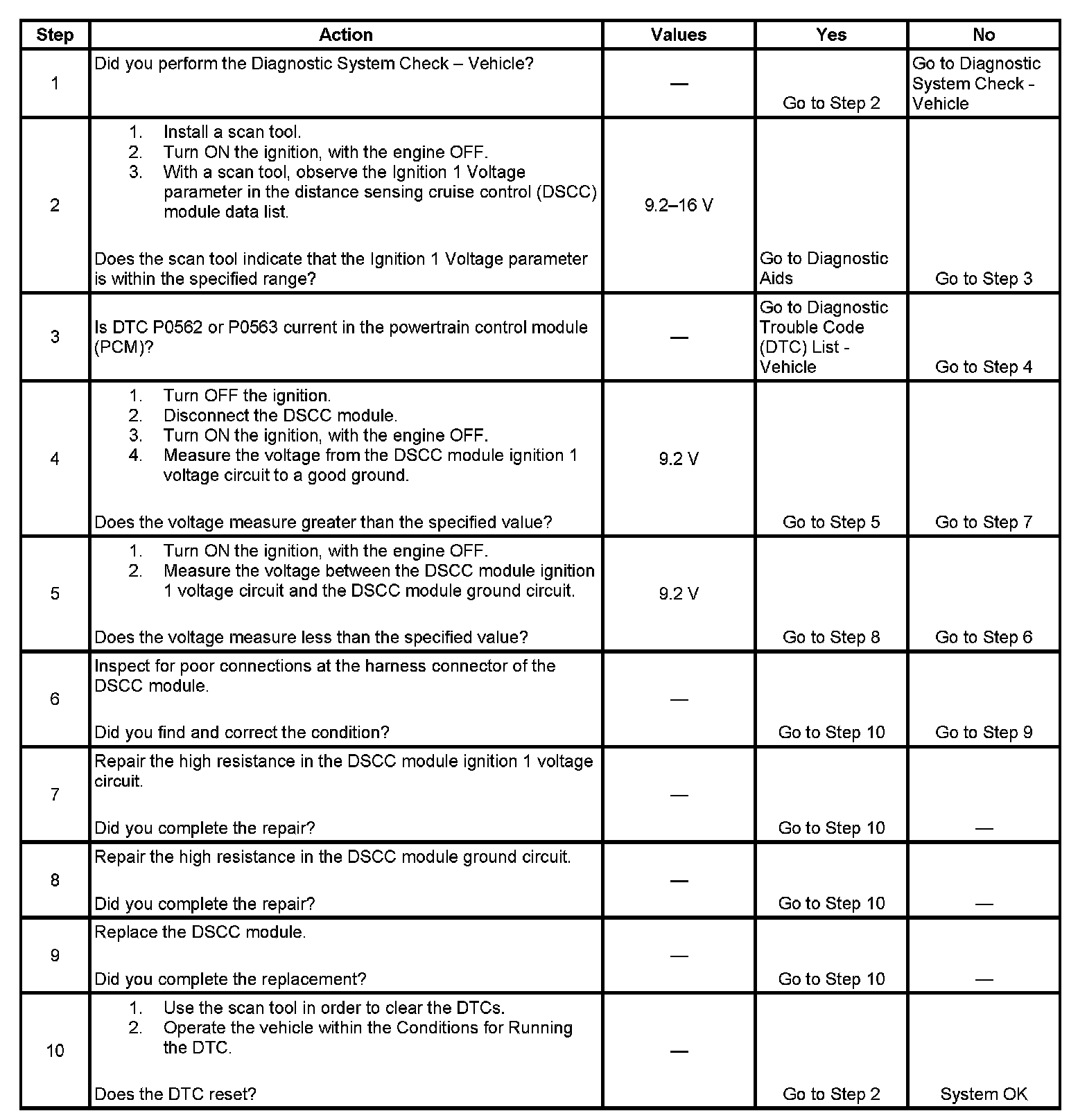 The distance sensing cruise control (DSCC) module monitors the ignition 1 voltage circuit in order to determine if the voltage is within the normal operating range.